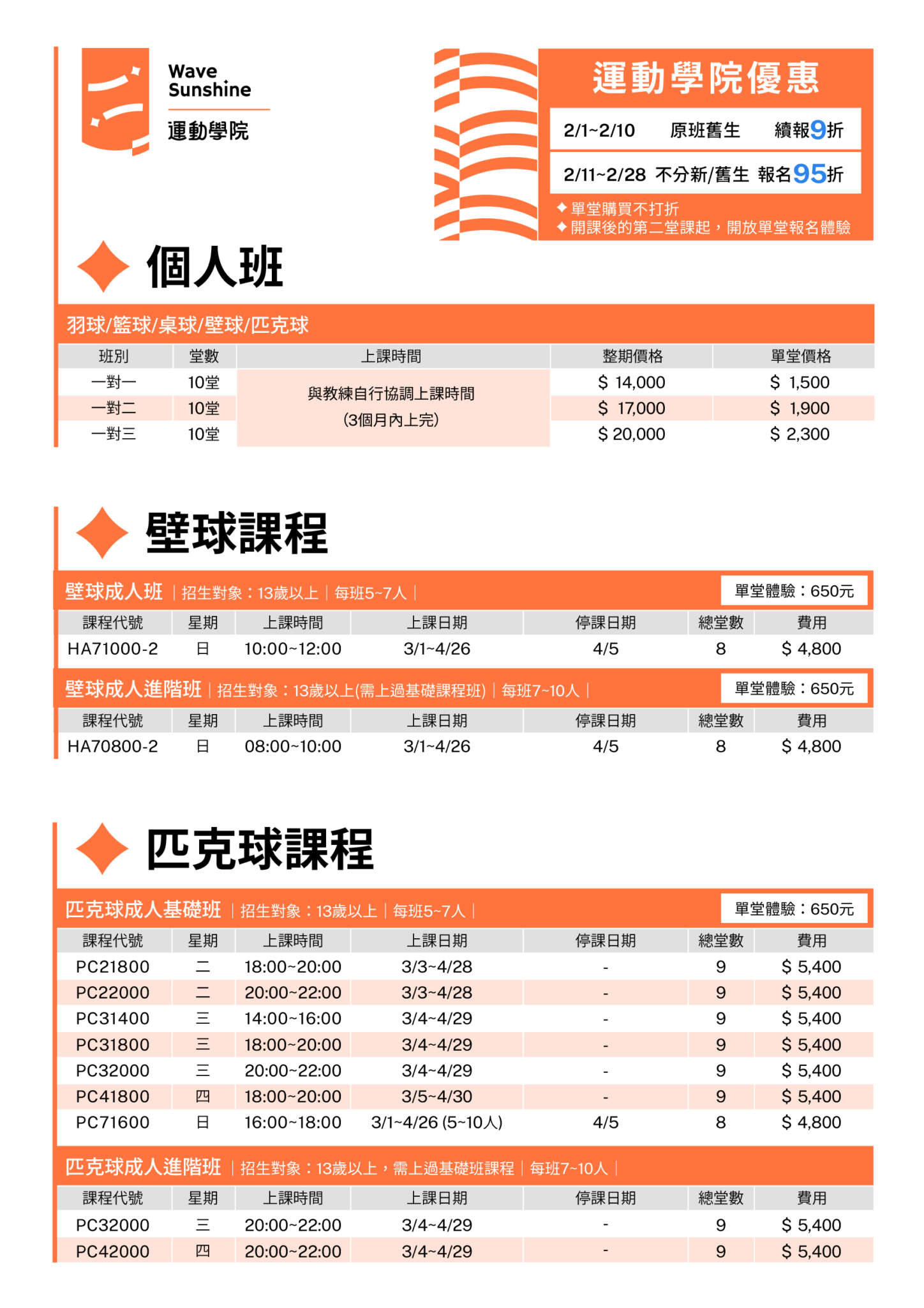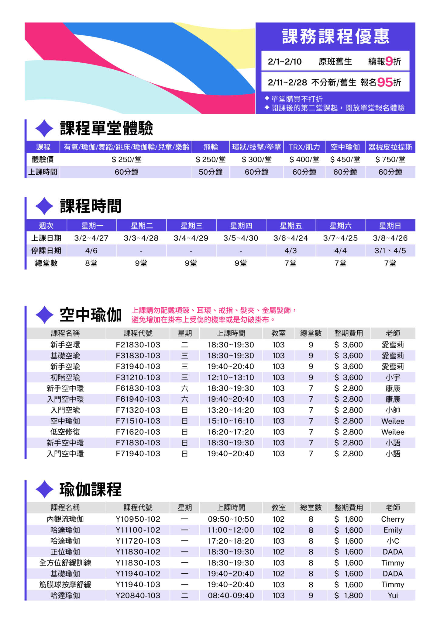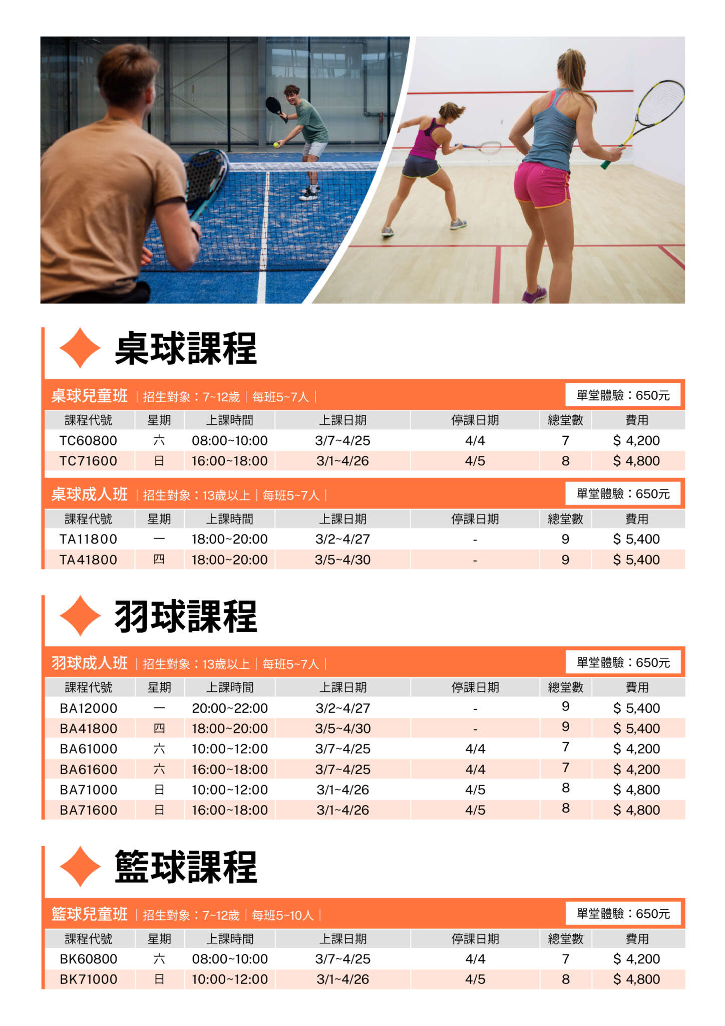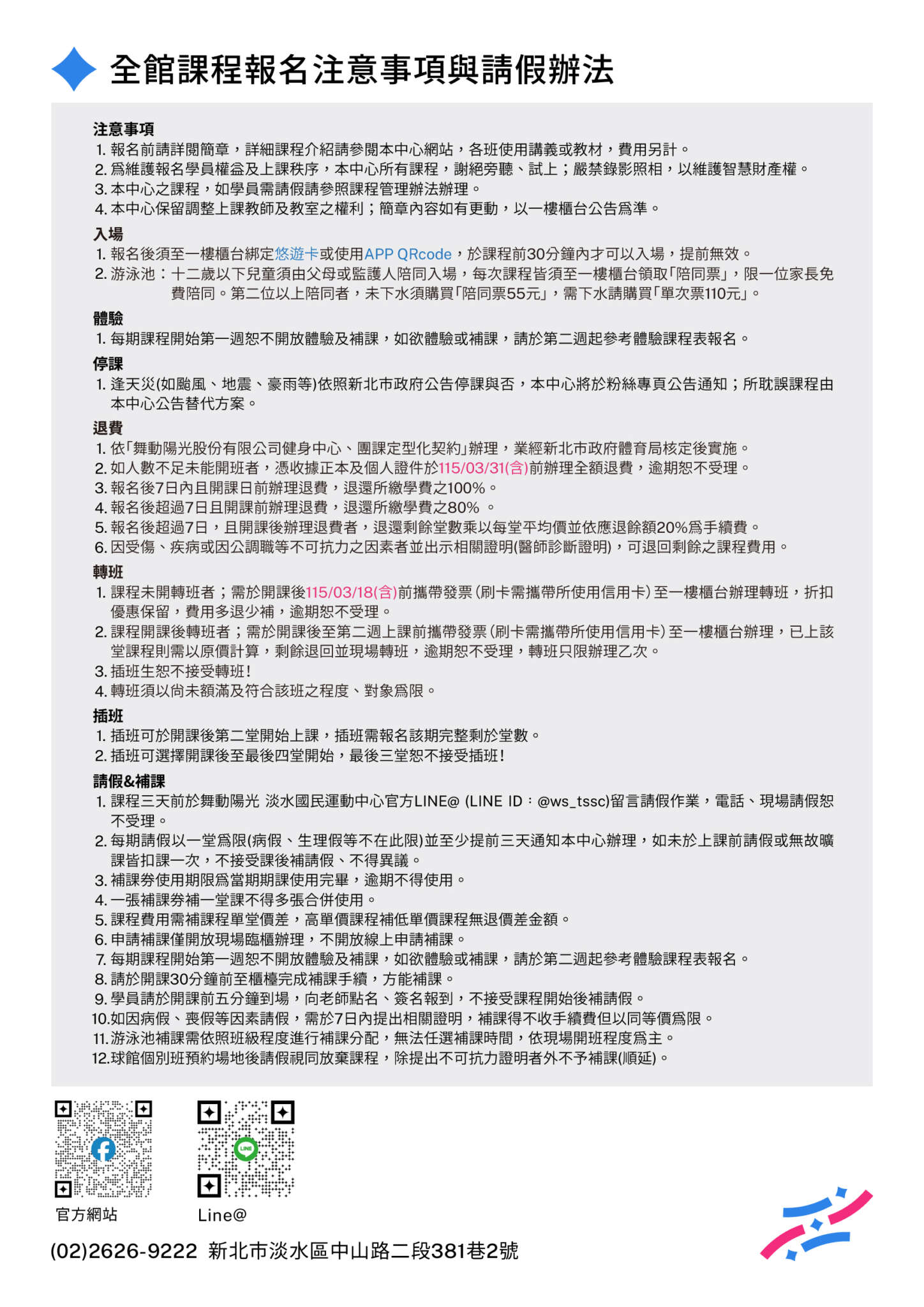 2026-01-30 淡水國民運動中心 in 最新活動 29132 115年03月-04月期課課表 團課課程・游泳課程・球類課程 專業師資帶領,讓運動成為日常。 優惠期間 2/1 – 2/10|舊生報名 9 折 2/11 – 2/28|新生優惠 95 折 名額有限,額滿為止 課程詢問:https://lin.ee/OTgw9WP 線上報名:https://reurl.cc/vvggLj