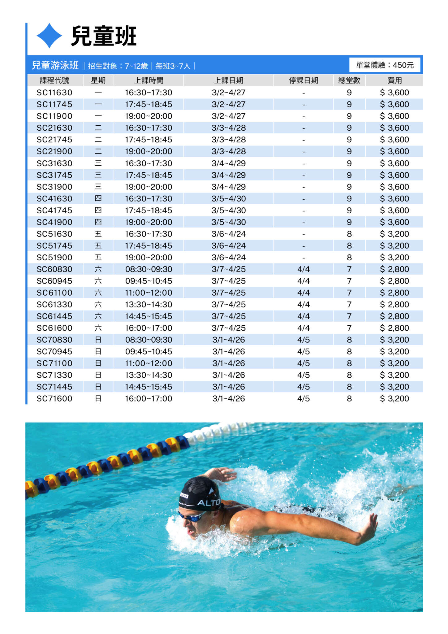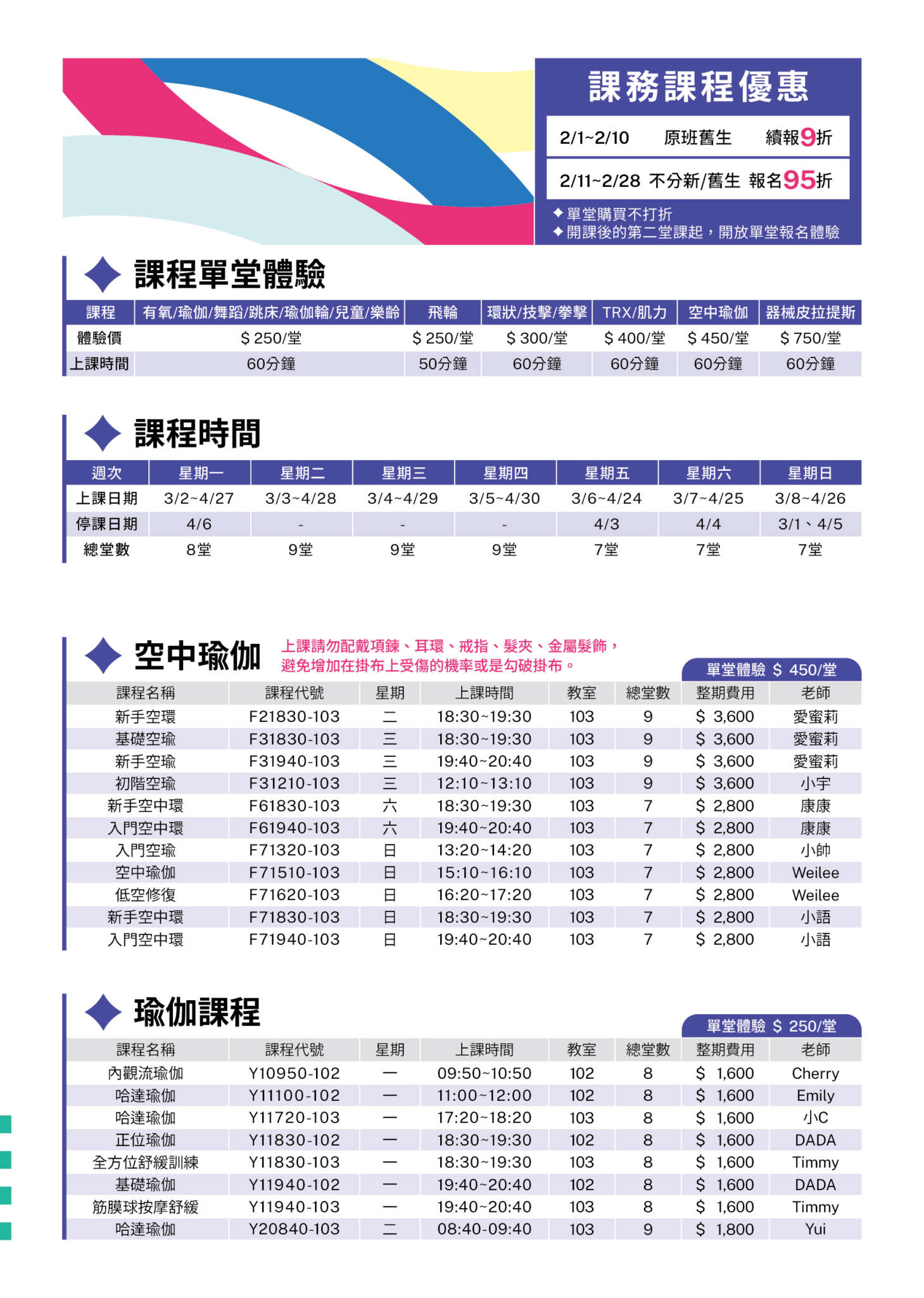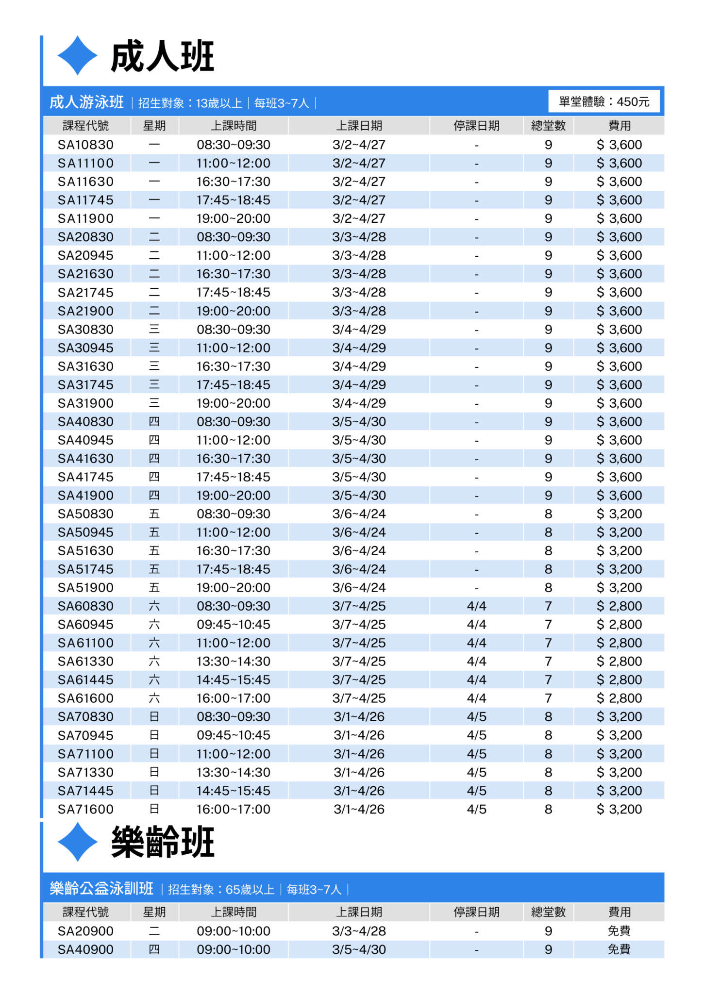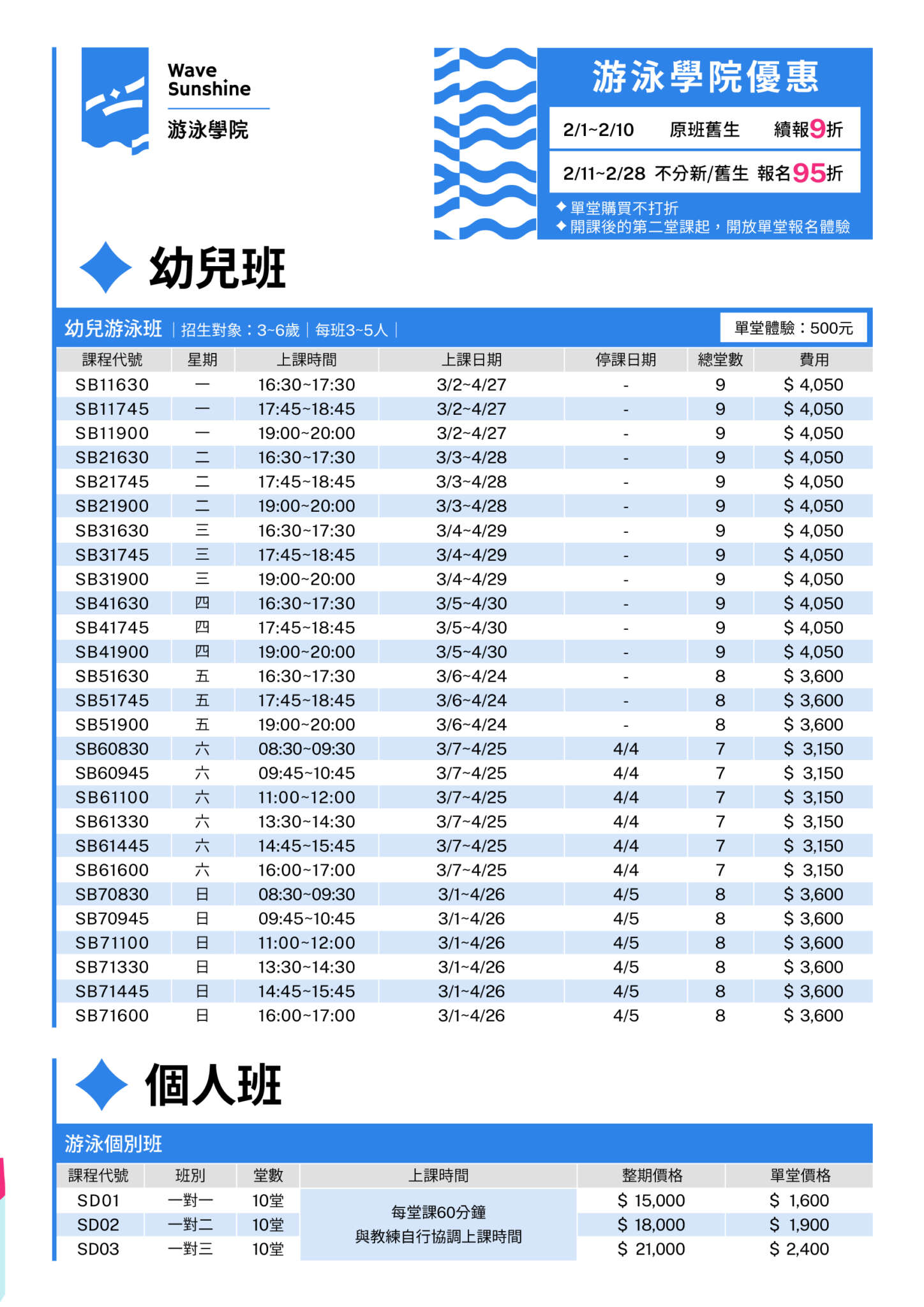 2026-01-30 淡水國民運動中心 in 最新活動 29132 115年03月-04月期課課表 團課課程・游泳課程・球類課程 專業師資帶領,讓運動成為日常。 優惠期間 2/1 – 2/10|舊生報名 9 折 2/11 – 2/28|新生優惠 95 折 名額有限,額滿為止 課程詢問:https://lin.ee/OTgw9WP 線上報名:https://reurl.cc/vvggLj